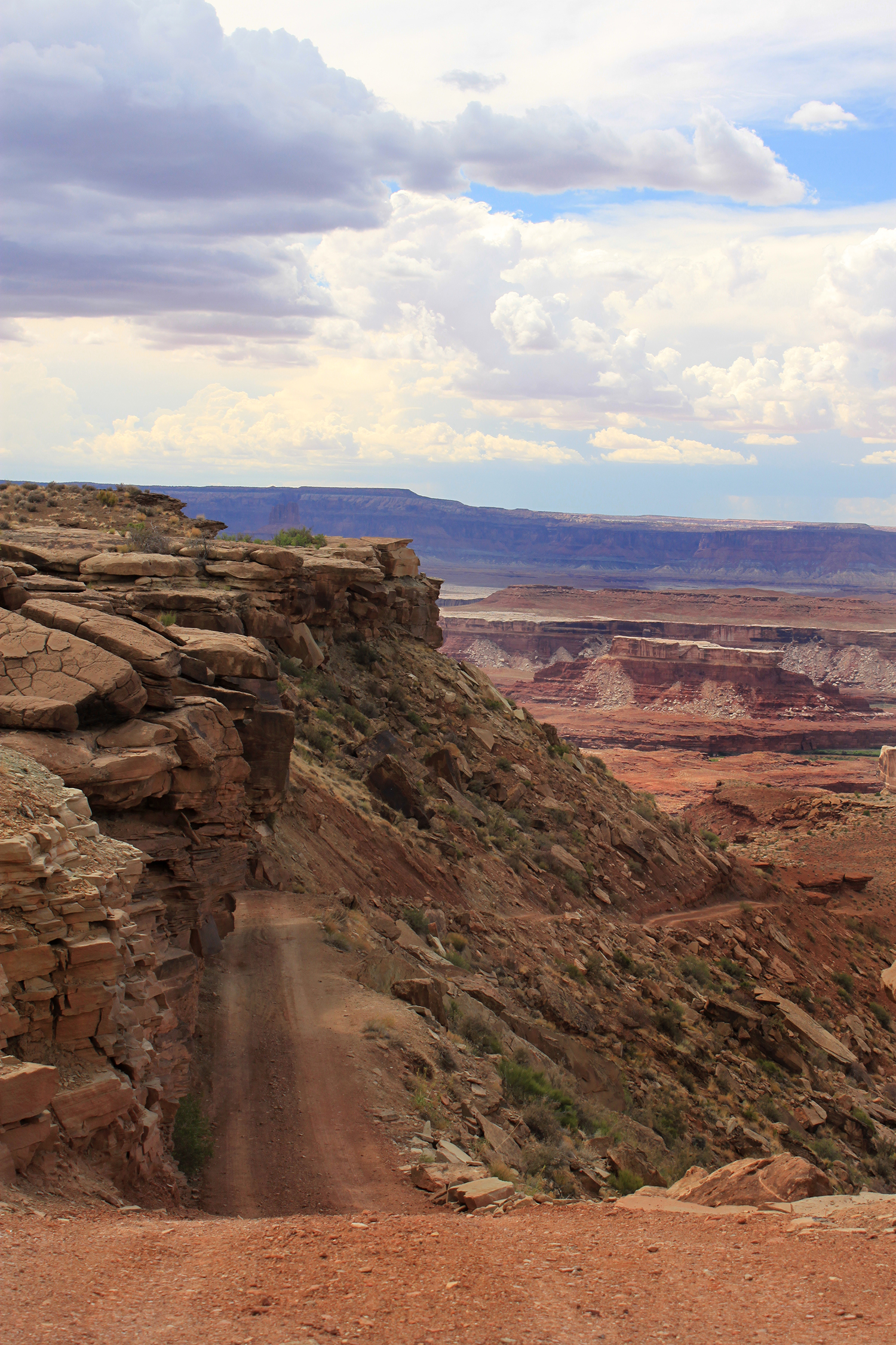 Most of the trail is a narrow one lane wide carved onto the side of a cliff and the trail can take a sharp turn just beyond the top of a rise.