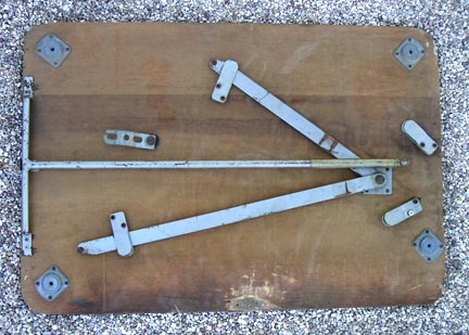 is made from 1/2 inch plywood, 20 X 29-3/8 inches with a 1-3/4 inch corner radius. It has a Formica top (some have Formica in the bottom as well). There is no edging.